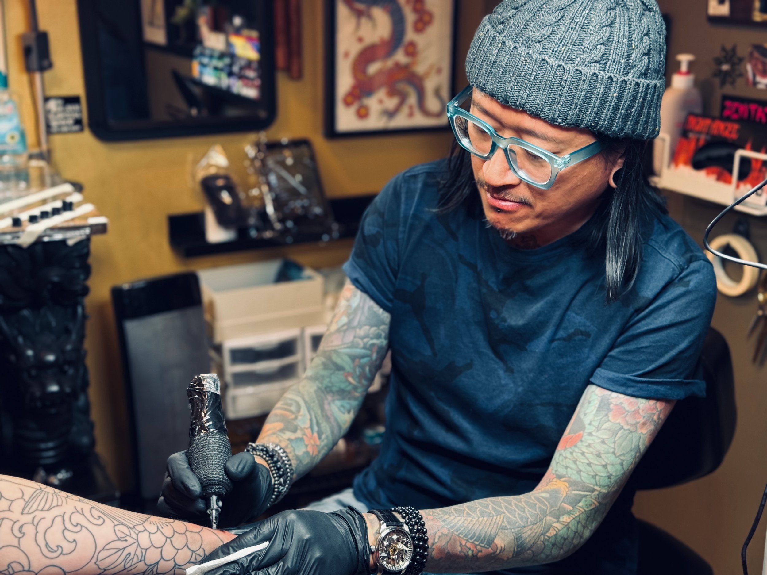 Thai specializes in Japanese traditional tattooing, a style known for its rich history, intricate designs, and deep cultural significance. His work is heavily influenced by old Japanese woodblock prints and renowned artists such as Filip Leu and Horiyoshi III, whose techniques and visions have shaped his approach to tattooing. Thai's philosophy centers on creating hand-drawn designs that harmonize with the body's contours, emphasizing the simplicity and natural flow of each piece.